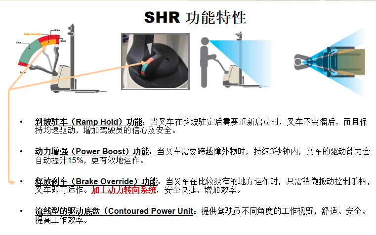 操作轻松简单 ——单手即可操作重达4000磅(1590kg)的货物。制动超越功能方便在极其狭小空间内进行作业,手柄几乎处于垂直位置。低位动力装置、清晰的门架设计(带嵌套式导轨)和高效的液压软管布置提供了良好的视野,便于快速安心地搬运高位货物。