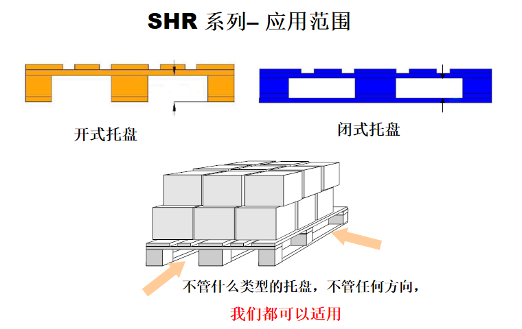 适用各种类型托盘——SHR步行前移式堆高车系列所采用的剪刀叉式前移装置融合了跨腿式堆高机的灵活操控性和平衡重叉车的广泛应用性,能够搬运各种类型的托盘。