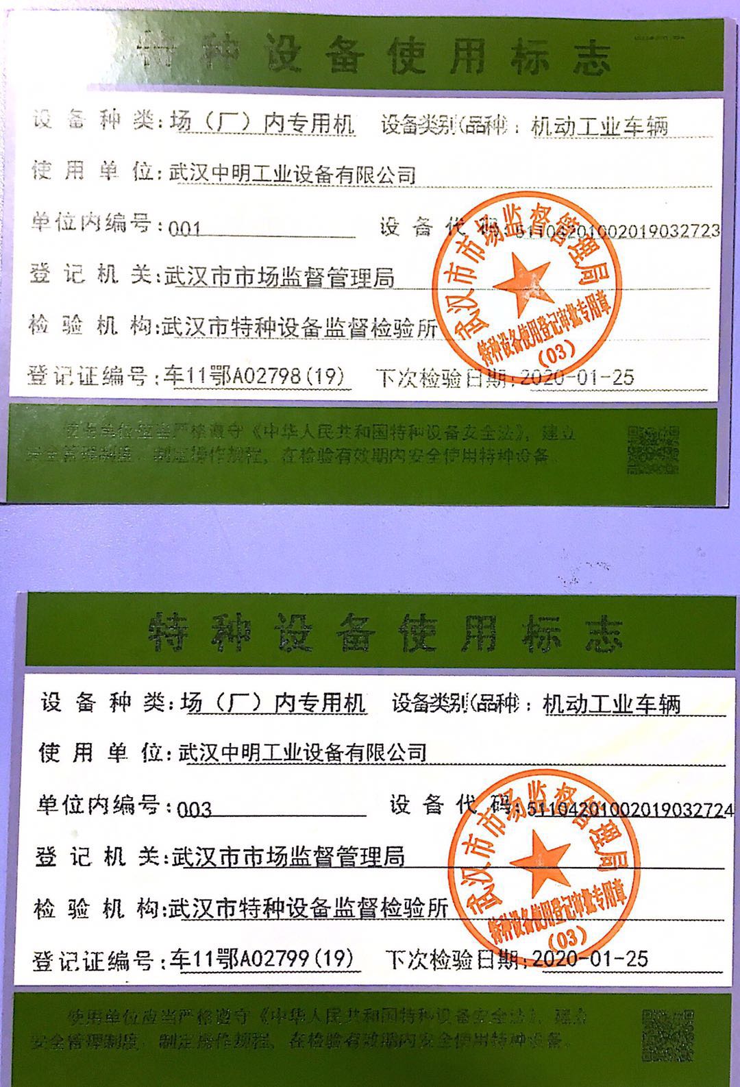 检验机构会在收到报检登记后15个工作日内,由检验员协调时间上门对叉车进行检验,上门检验合格后,需要在湖北省政务服务网申请使用登记证。