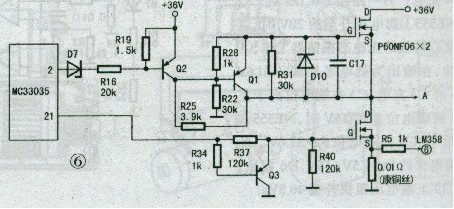 电池电压经R1、R2分压后加到LM358 ③脚,作为同相输入信号,MC33035⑧脚输 出的6.25V基准电压直接加到LM358的② 脚,作为反相输入信号。电池电压为36V时, LM358⑧脚电压约7.2V,高于②脚电压, LM358④脚输出高电平,D4截止,不影响 MC33035的工作状态;当电池电压下降至 31 V时,LM358⑧脚电压将低于6.25V, LM358q)脚输出低电平,D4导通,MC33035 的@脚电压降至近0V,电机停转,以防止蓄 电池过度放电o