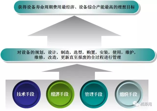 以生产经营为目标,通过一系列的技术,经济,组织措施,对设备的规划、设计、制造、选型、购置、安装、使用、维护、维修、改造、更新直至报废的全过程进行管理,以获得设备寿命周期费用最经济、设备综合产能较高的理想目标。