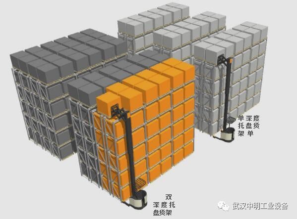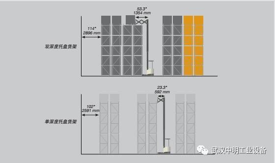 橙色标出的托盘位表示双深度托盘货架与单深度货架相比,能够获得的额外存储空间。增加的具体存储位视实际空间尺寸而定。
