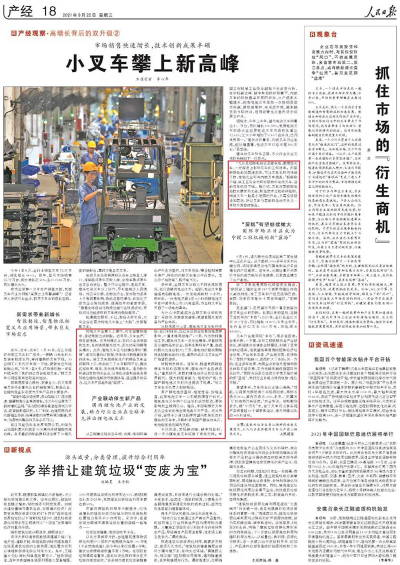 《人民日报》指出,想抢占新市场,叉车企业还需为传统叉车装上“大脑”,发展智能叉车。