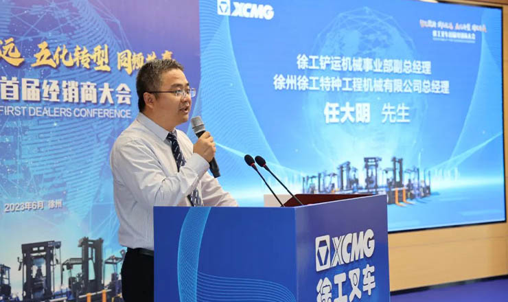 第二个环节是徐工叉车营销工作报告。徐工特机副总经理、营销公司总经理胡斯勒在会上作了营销工作主题报告,回顾近年徐工叉车取得的市场成就,从宏观角度深刻剖析全球及行业发展趋势,全面阐述了徐工叉车战略蓝图、经营模式、业务模式,开拓了我们经销商的经营思路和应对措施,鼓励叉车经销商们协同一致,行而不辍,未来可期。