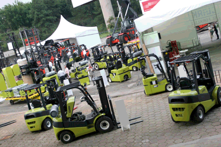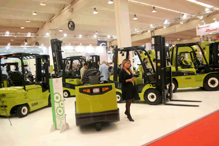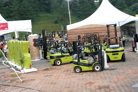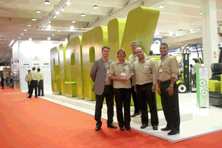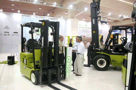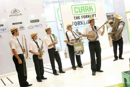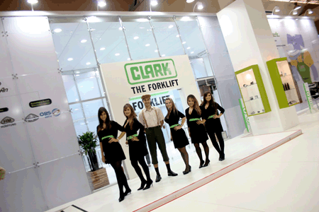 CLARK,身着传统环保CLARK绿色元素的标准图案闪亮登场,12台品字排开,气势夺人,另有配件展示在集装箱区域内做演示,展示强大售后服务力量,这是其品牌目前所不能披靡的。CLARK的亮点吸引了众多的客户和同行前来参观。由于参展产品的创新性及强烈的美国优良品质特性,吸引了众多感兴趣的客户签约及洽谈后期合作。