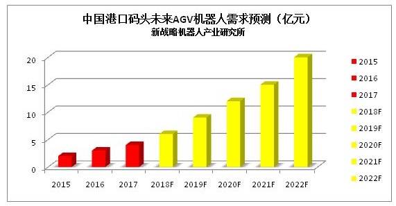 据测算,单个码头AGV小车的需求量约70台,中国主要的单个大型港口的总需求量保守估计在1500台,市场产值在5-10亿元人民币。截止2016年中国吞吐量过亿的大型港口就有十五个,如果按照每个大型港口平均500台(保守)AGV的需求量来算,就是7500台AGV产品,市场产值将是20-60亿人民币。这仅仅是吞吐过亿的十五大港口,中国货运码头港口总共超过500个。该市场需求将在较短时间内呈直线上升趋势,5年后逐步趋向稳定。可以预测,未来的几年,正因为巨大的经济和社会效益,港口应用将是AGV在中国富有前景的行业。